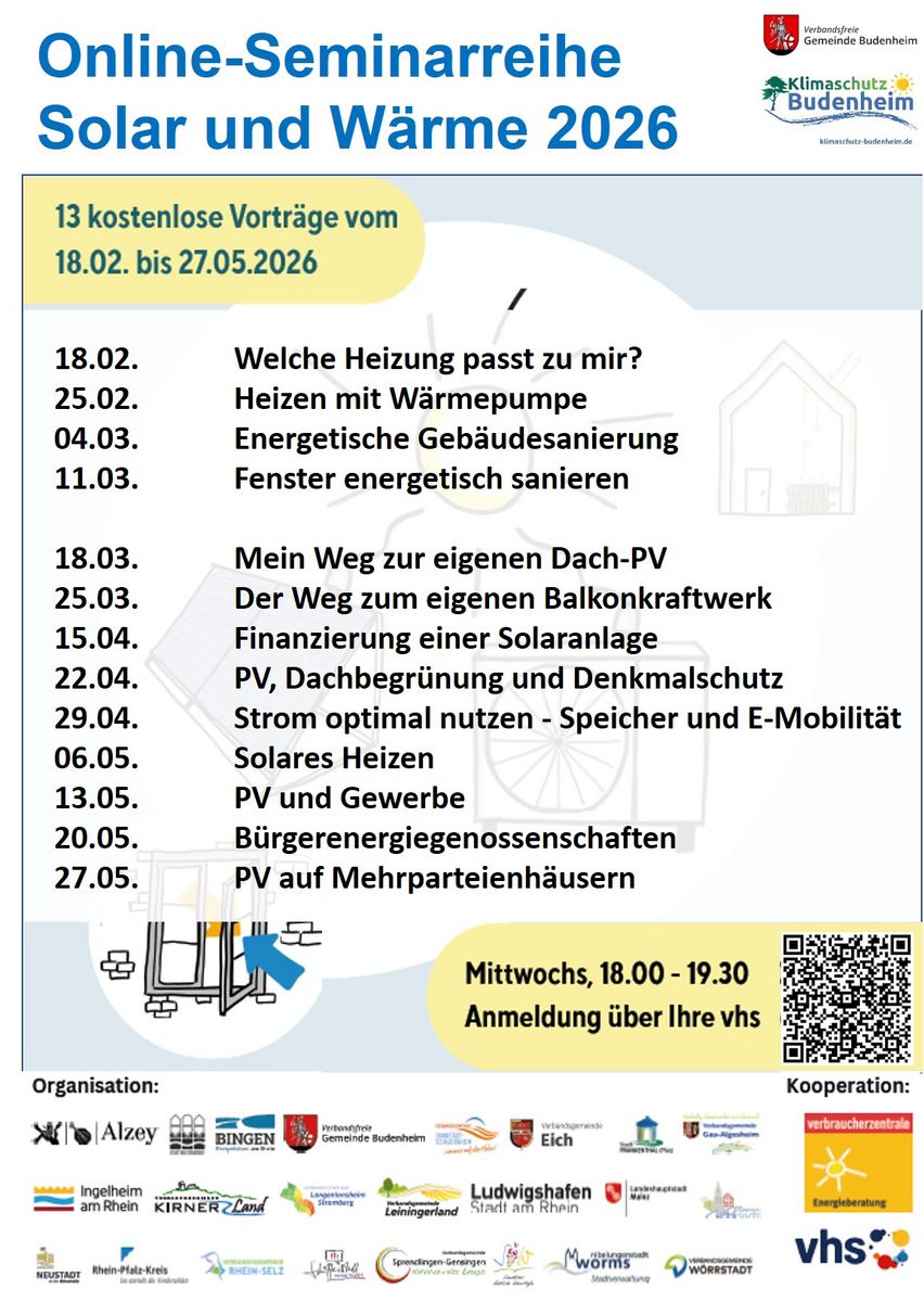 Klimaschutzbeauftragte, Volkshochschulen & Verbraucherzentraleder Regionen Rheinhessen-Nahe und Vorderpfalz laden zu 13 kostenfreien Online-Vorträgen ein, jeweils mittwochsabends von 18 bis 19:30 Uhr vom18. Februar bis zum 27. Mai 2026.